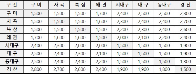 | 최대 요금 | 2,800원 (구미 ~ 경산) |