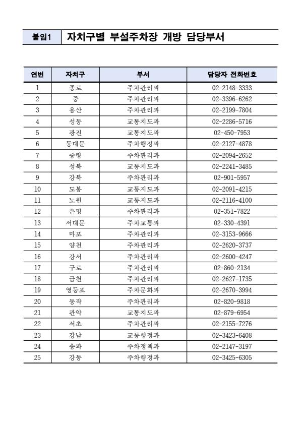 | 1. 신청 | 관할 자치구 주차관리과 또는 교통지도과에 신청 |