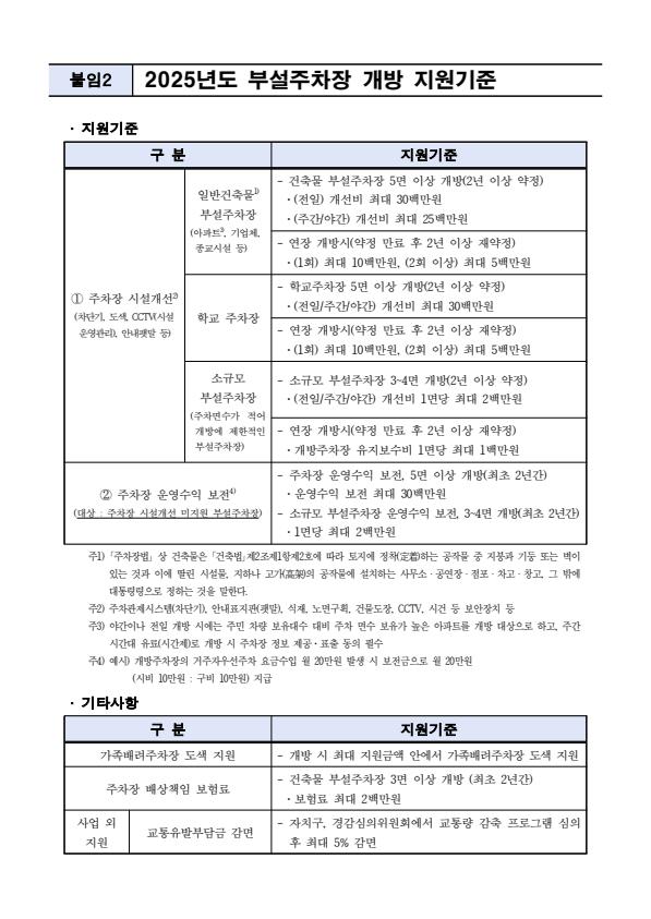 | 소규모 부설주차장 | 3~4면 개방(2년 이상) → 1면당 최대 2백만 원 지원 |