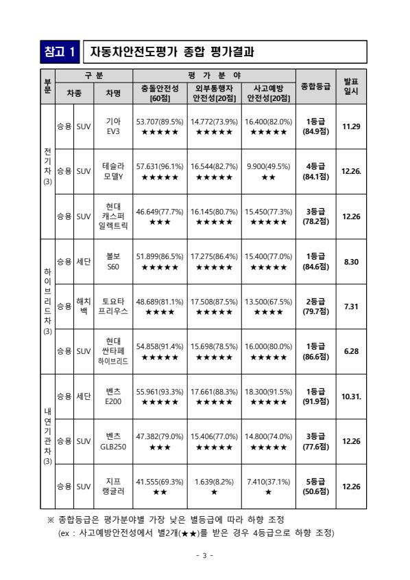 | 전기차 | 기아 EV3 | 충돌 안전성(★★★★★), 사고 예방 안전성(★★★★★) 외 | 1등급 |