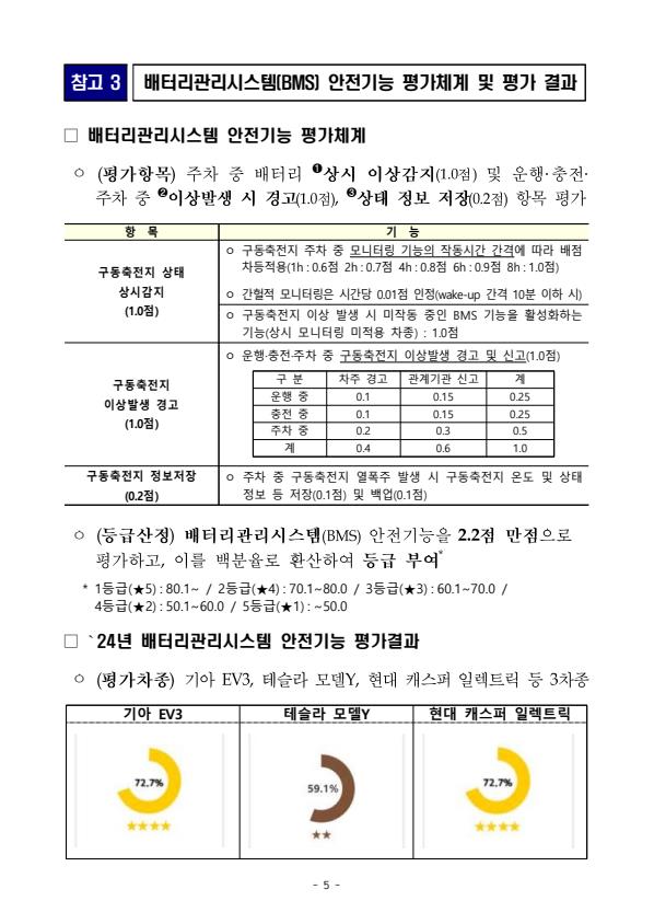 특히, 올해 처음으로 도입된 배터리관리시스템(BMS) 안전기능 평가에서는 전기차의 배터리 상태를 실시간으로 감지하고 이상 상황을 경고하는 기능을 평가했어요.